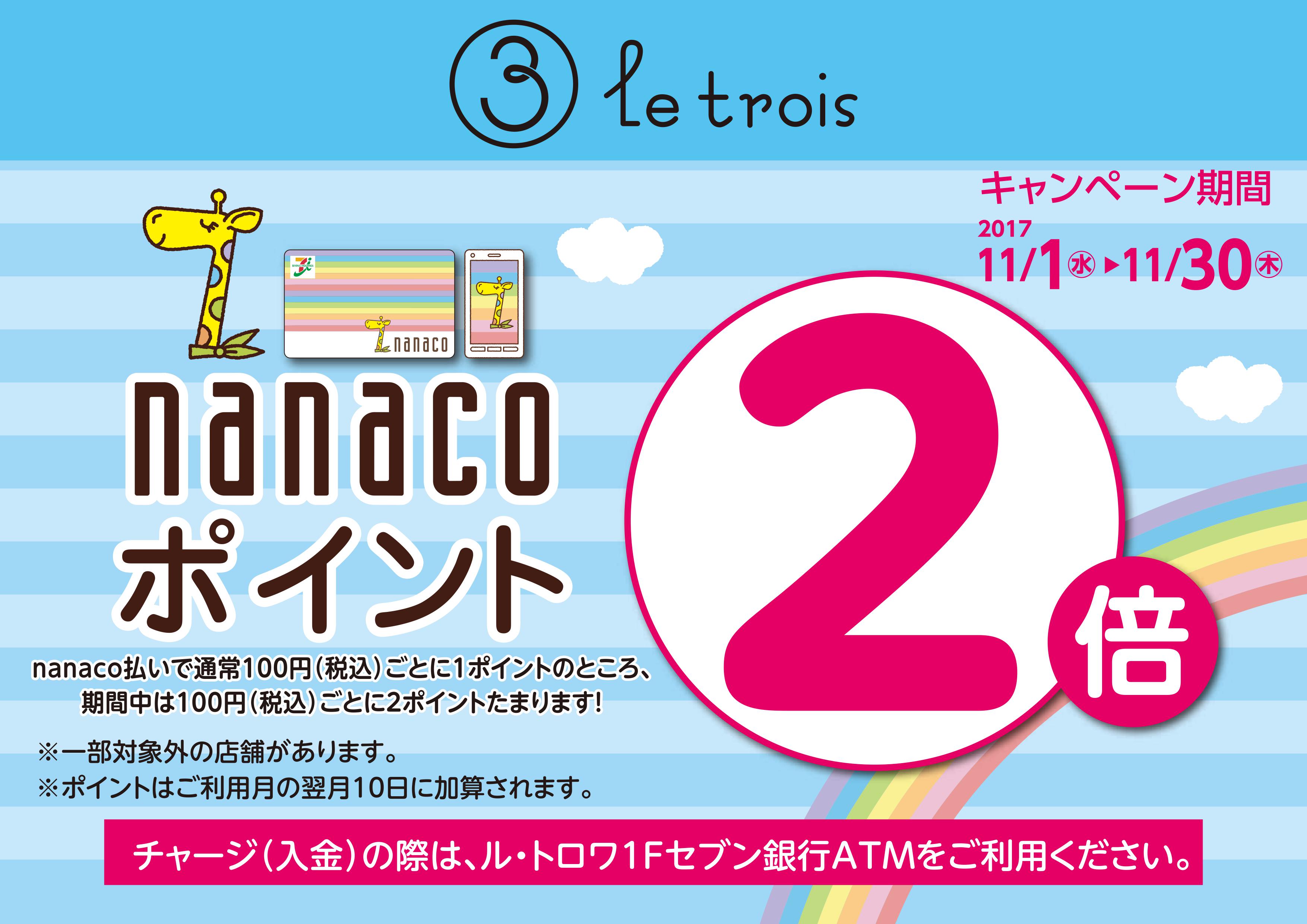ル・トロワでは、11月1日(水)から30日(木)、電子マネー「nanaco」のポイント2倍を実施いたします。