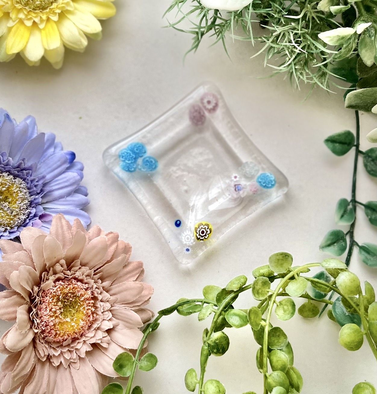 7×7cmの透明ガラスの上にミルフィオリを並べてデザインします。
