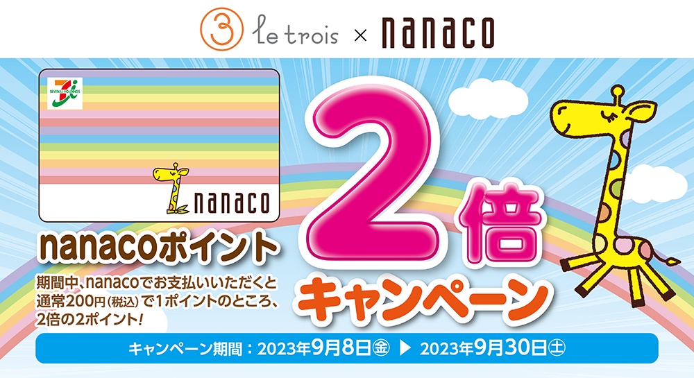 期間中、nanacoでお支払いいただくと通常200円(税込)で1ポイントのところ、期間中は200円(税込)で2ポイントが付きますので是非ご利用ください!!