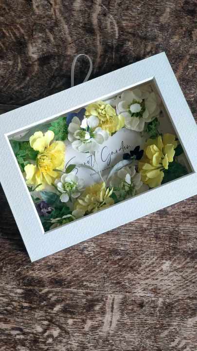 春らしい花や草を、そのままの色や形に乾燥させて、はがきサイズの台紙にアレンジメント。