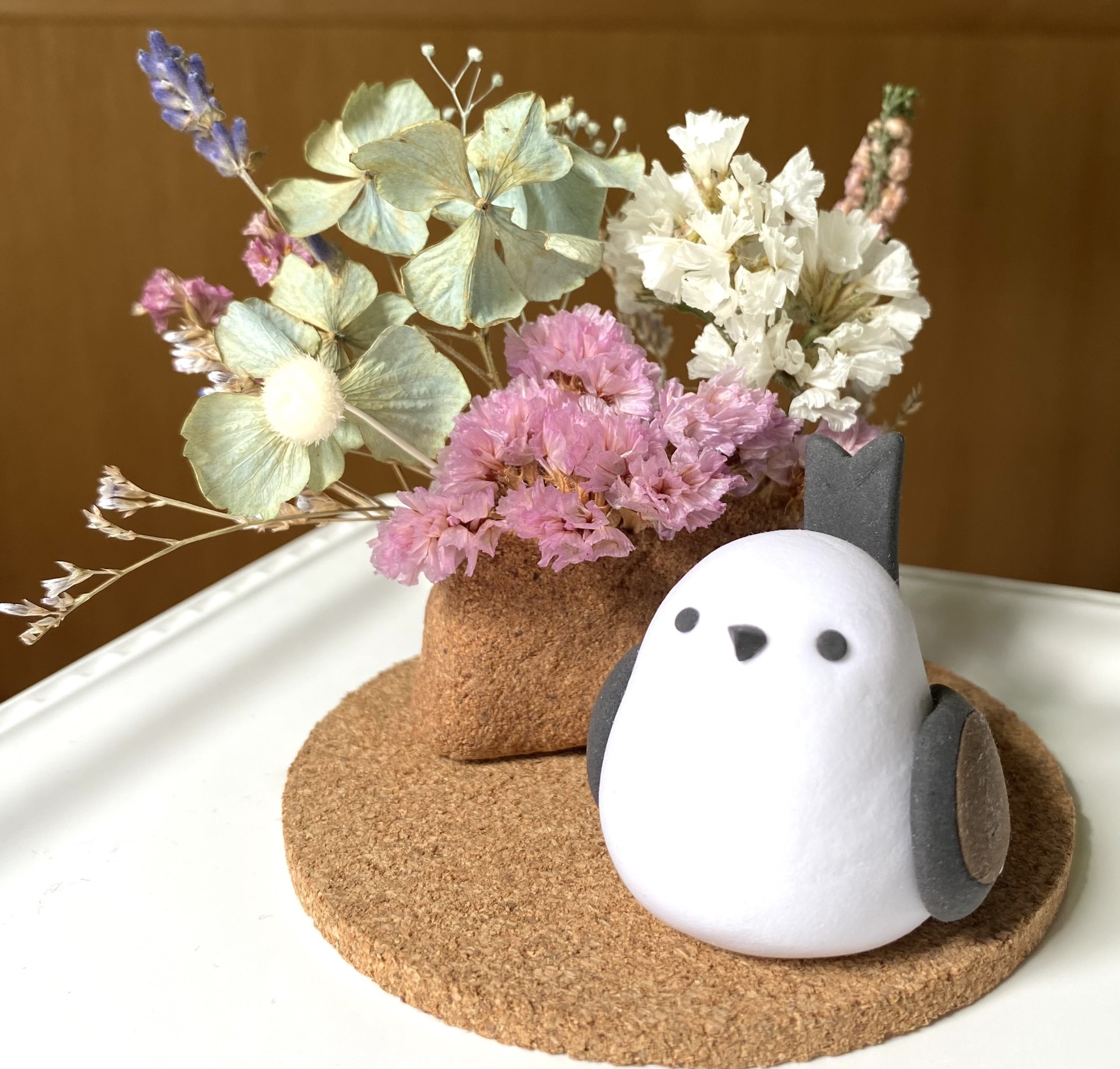 紙粘土で作る可愛いシマエナガと、講師の庭で大切に育てられた花を使用した優しい色合いのドライフラワーアレンジメントを作ります。