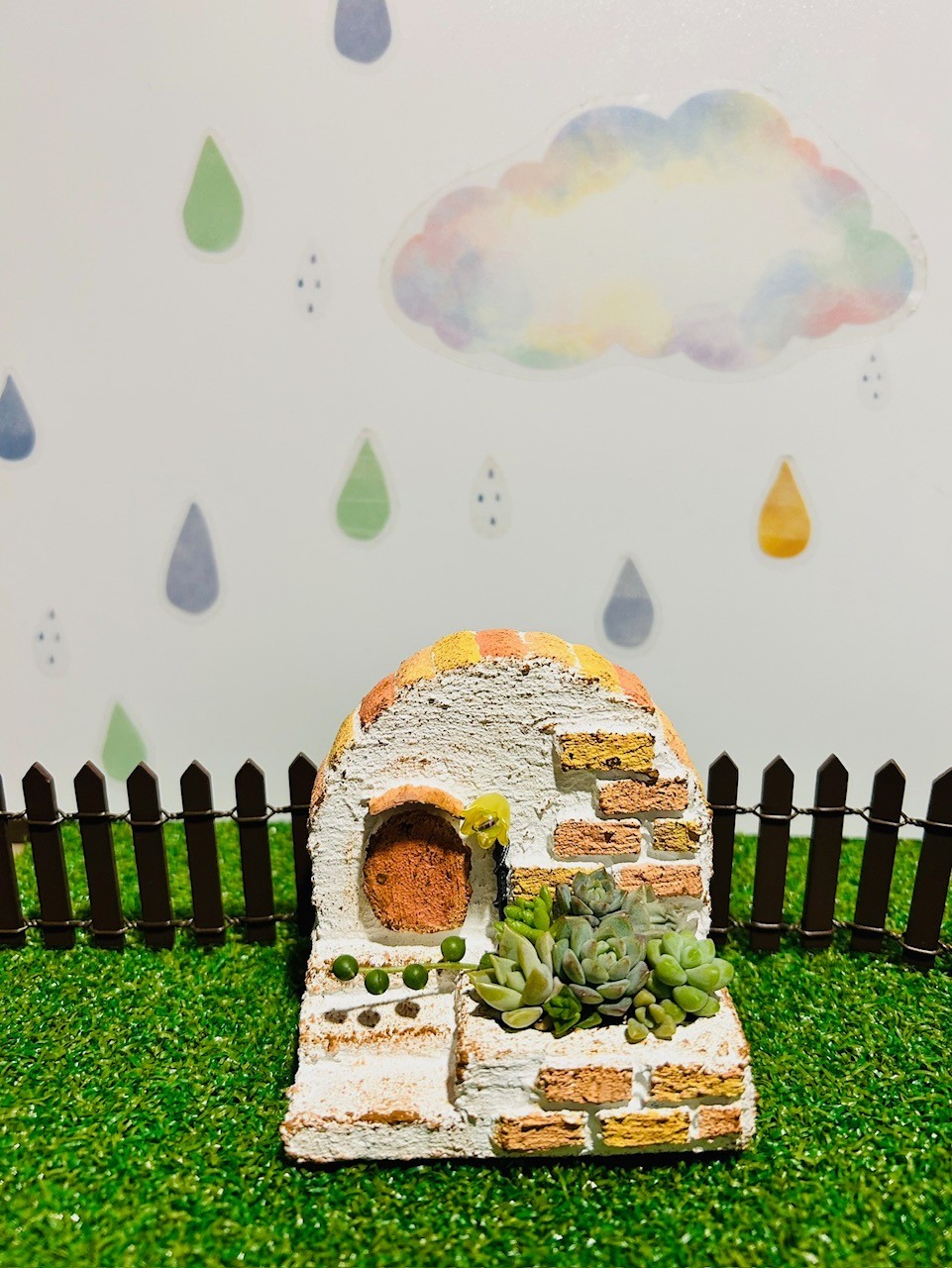今回はモルタルデコハウスのレンガにペイントをしてオリジナルミニガーデン風に。