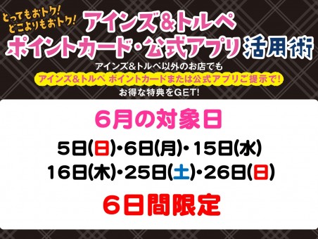 ★アインズ&トルペポイントカードまたは公式アプリ提示で更におトク★ ■対象日:2022年6月5日、6日、15日、16日、25日、26日の6日間限定 ポイント・・・
