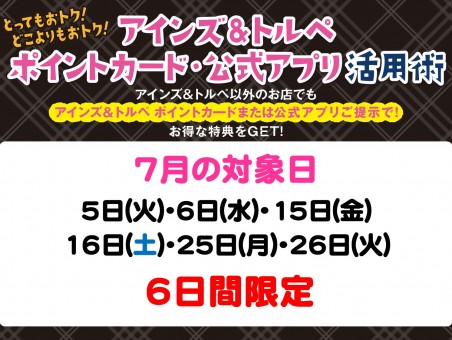 ★アインズ&トルペポイントカードまたは公式アプリ提示で更におトク★ ■対象日:2022年7月5日、6日、15日、16日、25日、26日の6日間限定 ポイント・・・