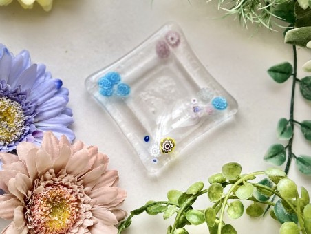7×7cmの透明ガラスの上にミルフィオリを並べてデザインします。 焼成後に郵送いたします。 ※ベネチアンガラスの箸置きのお土産つきです。 ■開催日 :・・・