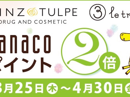 ル・トロワでは、3月25日(木)から4月30日(金)、電子マネー「nanaco」のポイント2倍を実施いたします。 通常、100円(税込)で1ポイントのところ、・・・