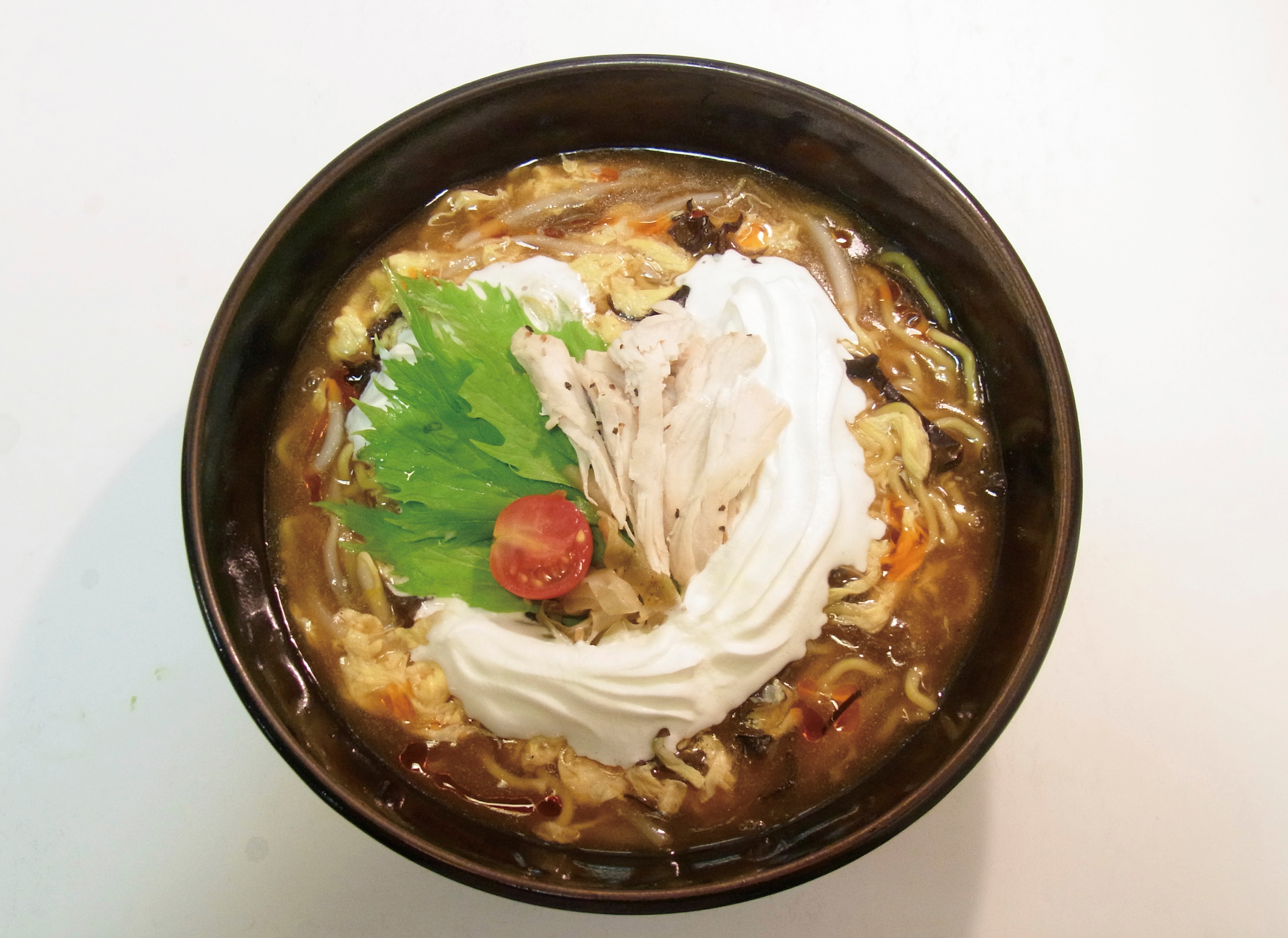 鶏清湯スープに豆乳ムースをトッピングしたヘルシーな一品。