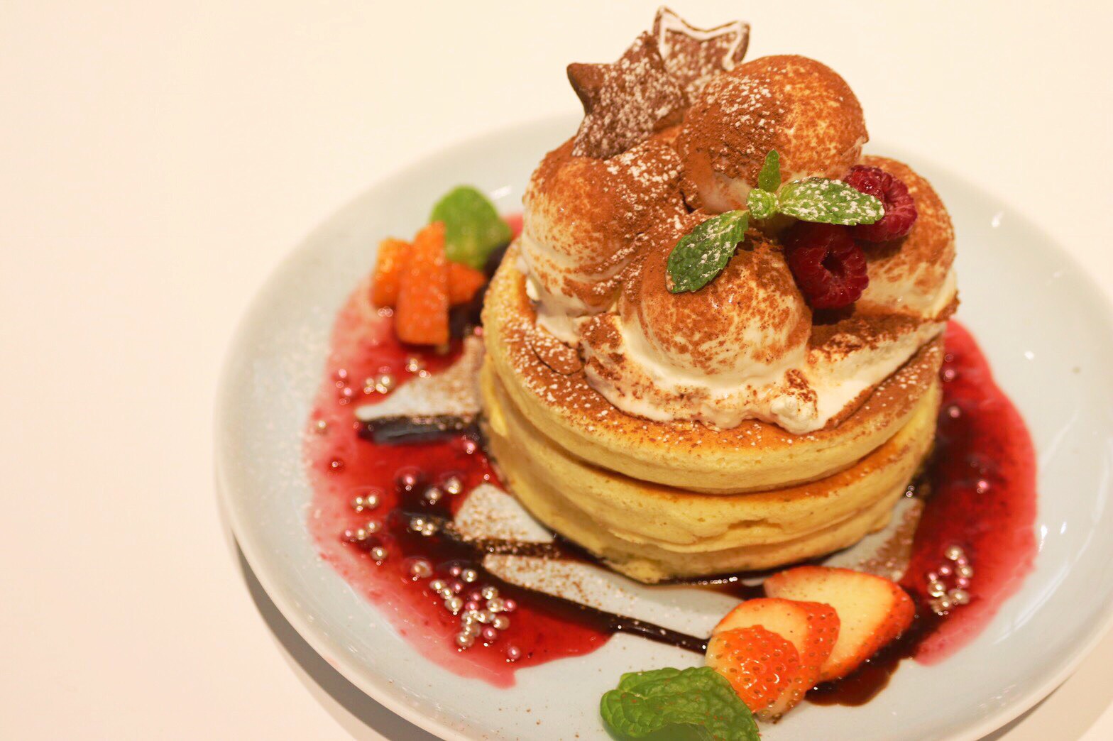 エスプレッソソースを使用したパンケーキに、クリームチーズのジェラートをのせ