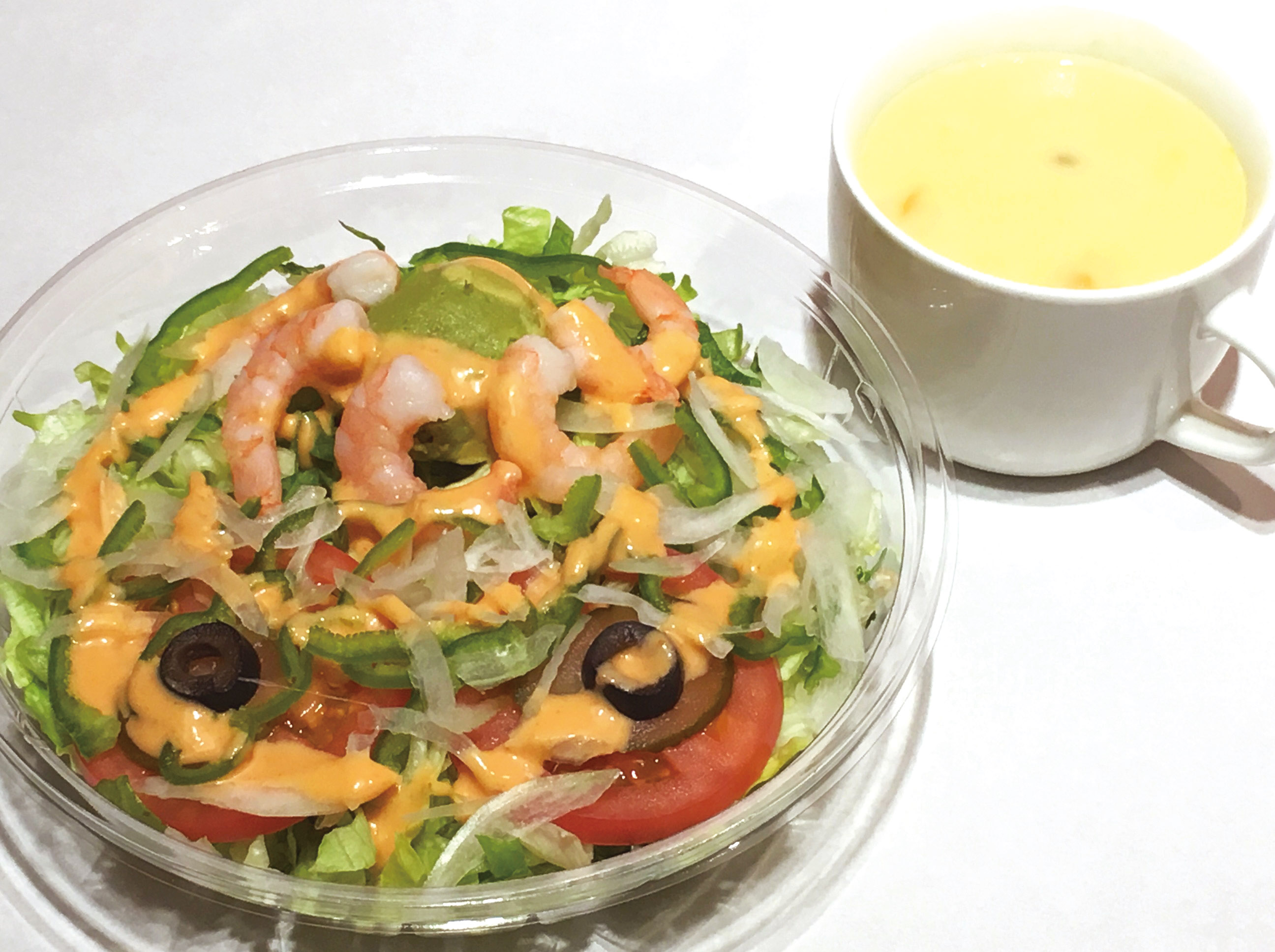 えびアボサラダとスープ(コーン、ミネストローネ、グリーンのいずれか)のセット。