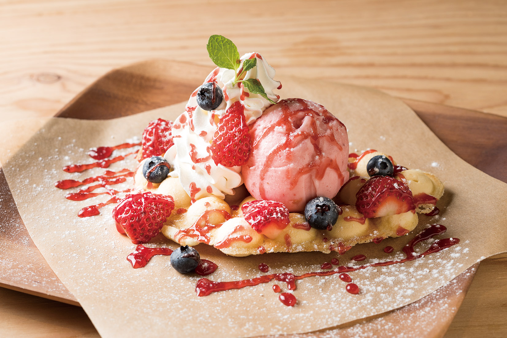 モチふわ生地のワッフルを生クリームやイチゴ、ブルーベリー、ベリーソースでデコレーション。