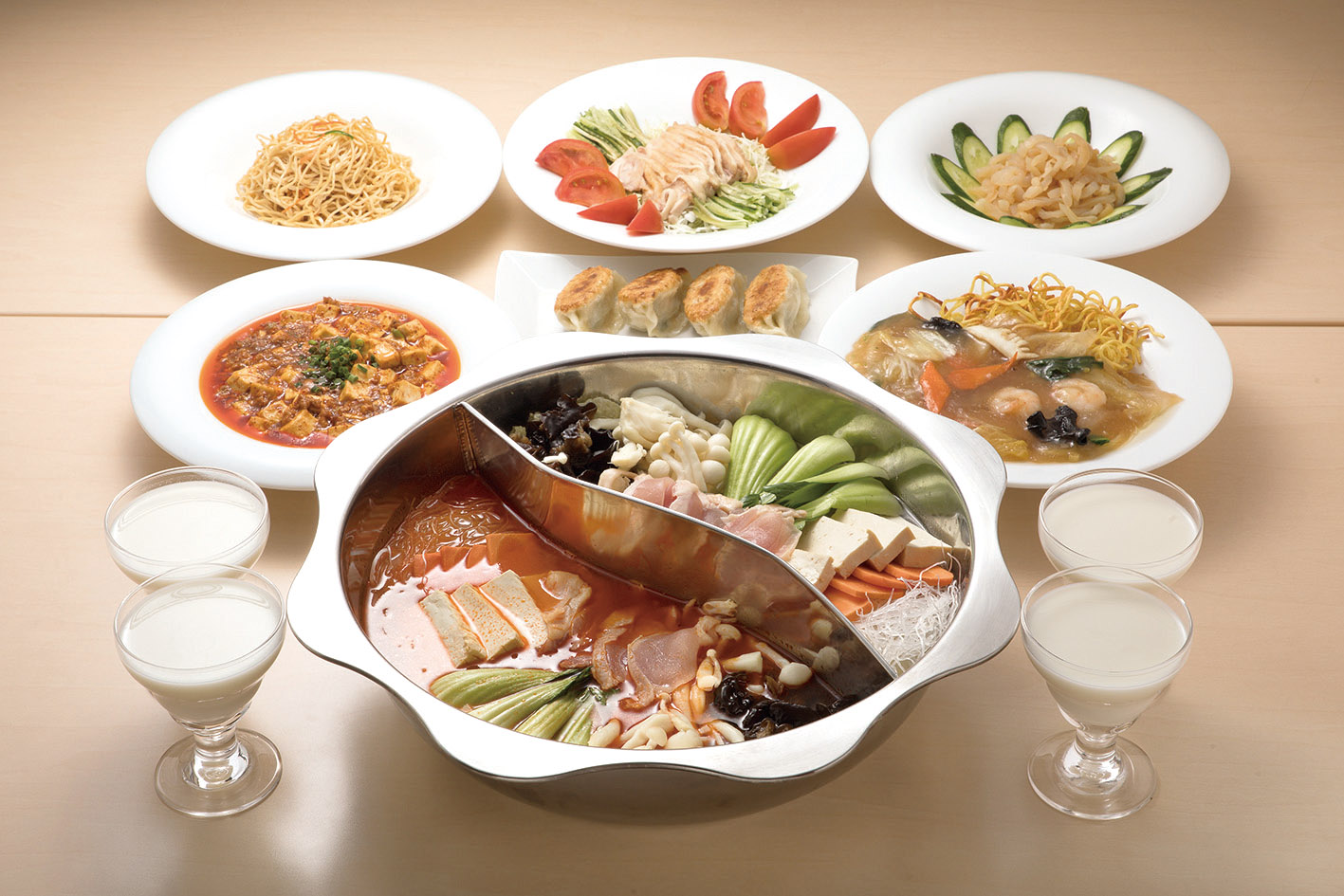 (前菜2種、トマトスープと白湯スープの2色鍋、本日のサラダ、焼き餃子、麻婆豆腐、五目あんかけ焼きそば、本日のデザート)