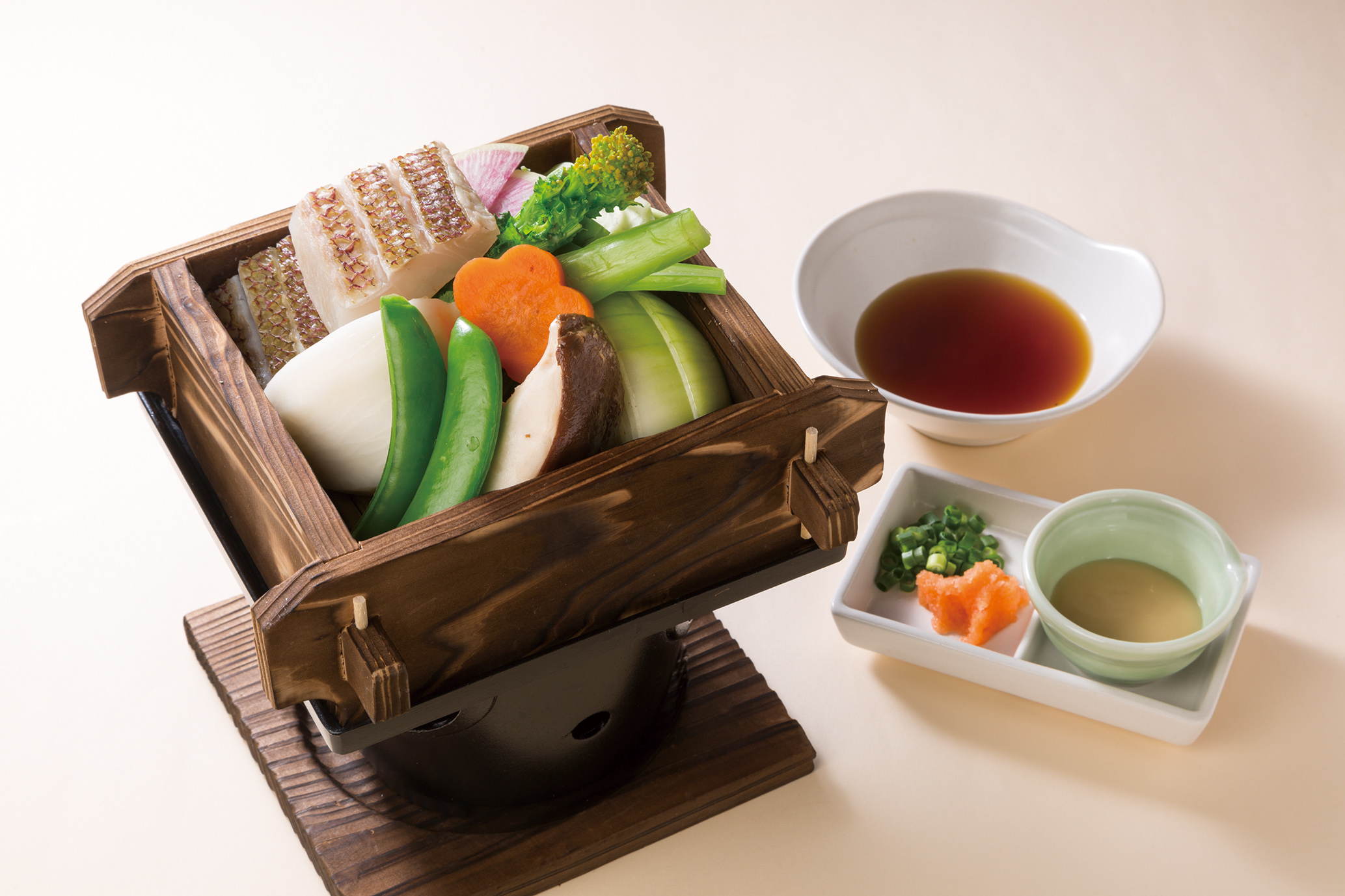 今が旬の鯛を春キャベツや新タマネギなど5種類の季節野菜と共に、セイロで蒸し上げました。