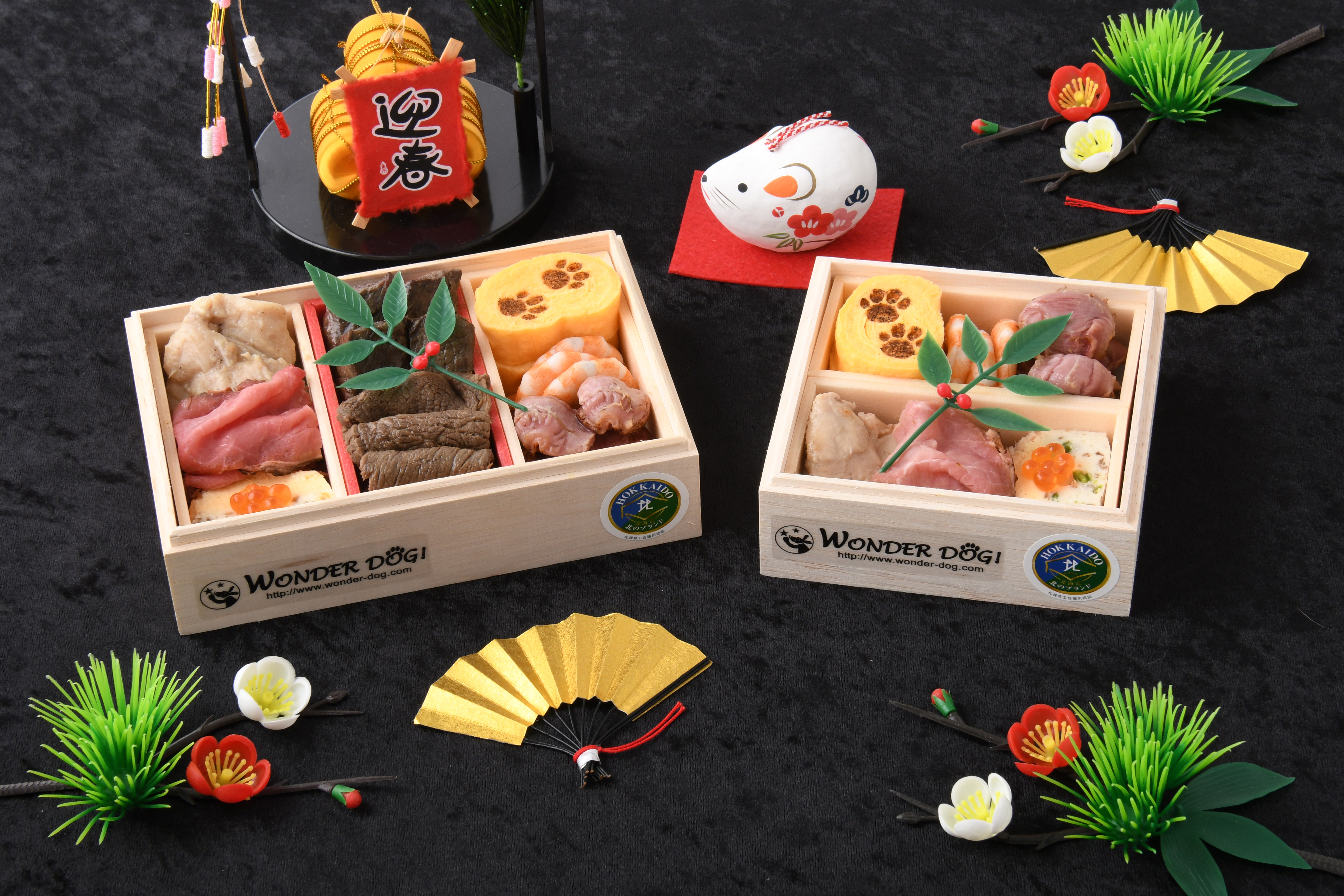 新年を鮮やかに飾る、豪華な愛犬用おせち。厳選された北海道の素材をお楽しみいただけます。
