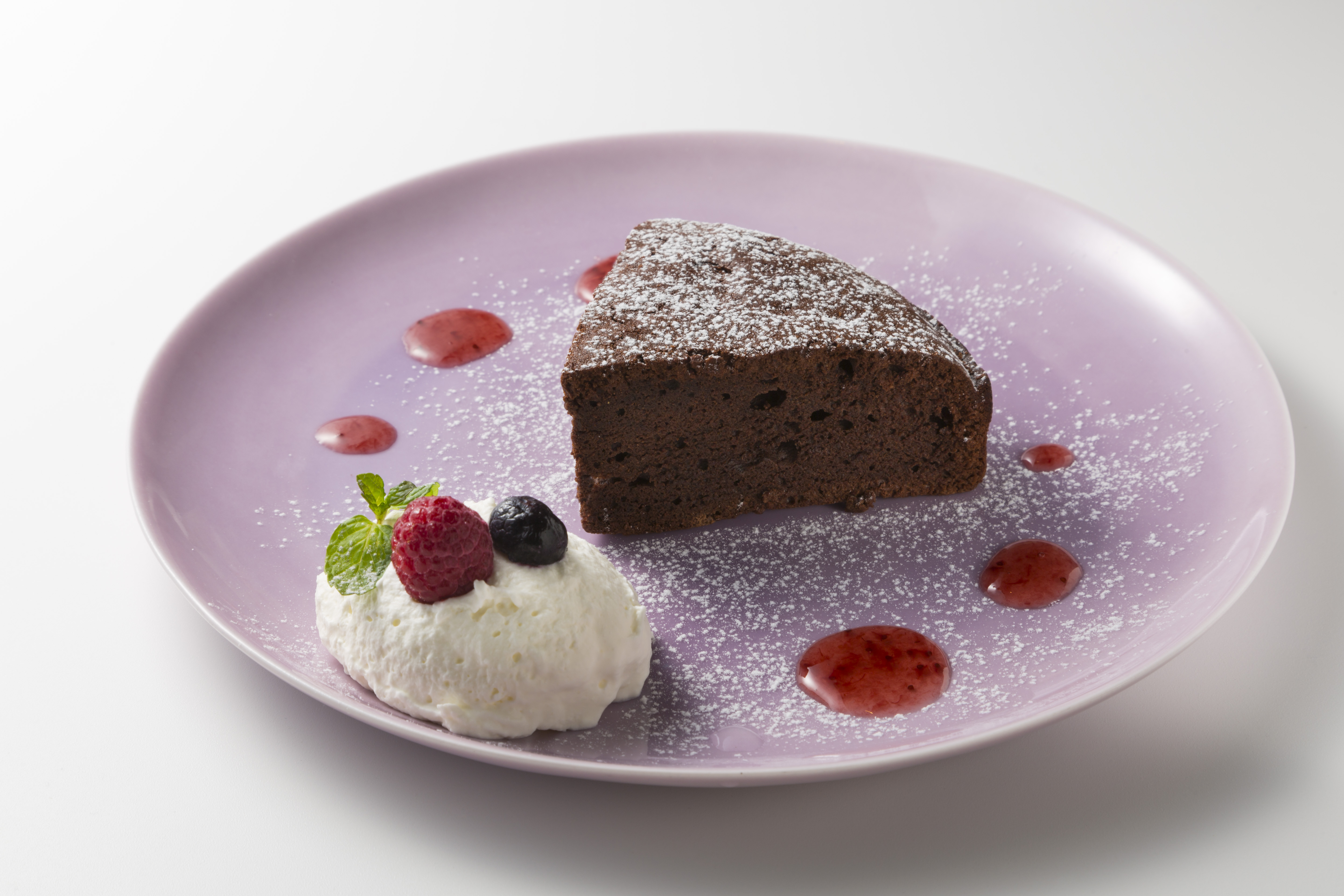 しっとり濃厚なガトーショコラを、おしゃれに盛り付け。