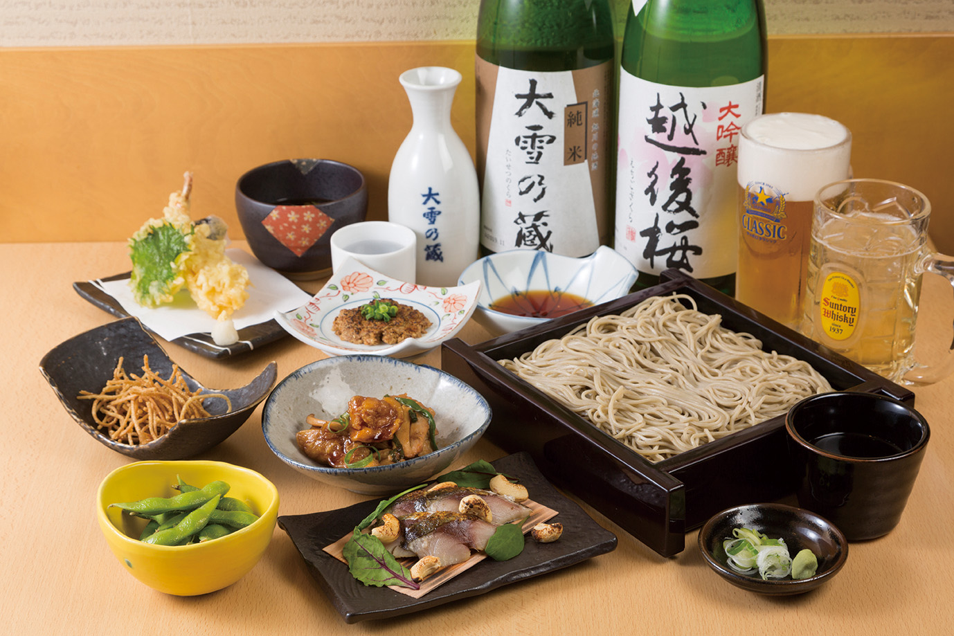 そばチップ、枝豆、自家製焼き味噌、かしわ焼き、炙りしめ鯖、