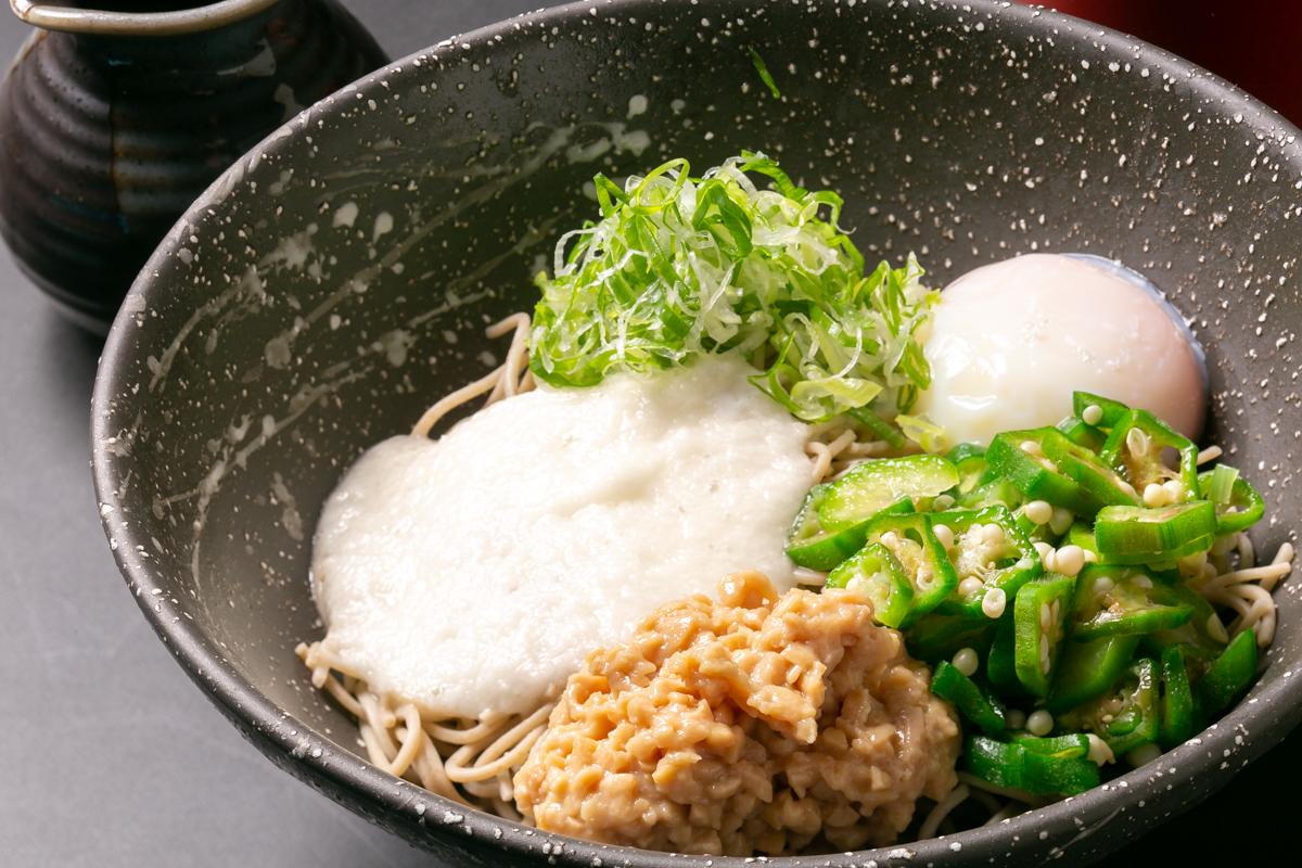 オクラ、とろろ、納豆をのせた、食欲にない夏でも食べたくなる冷たいお蕎麦。