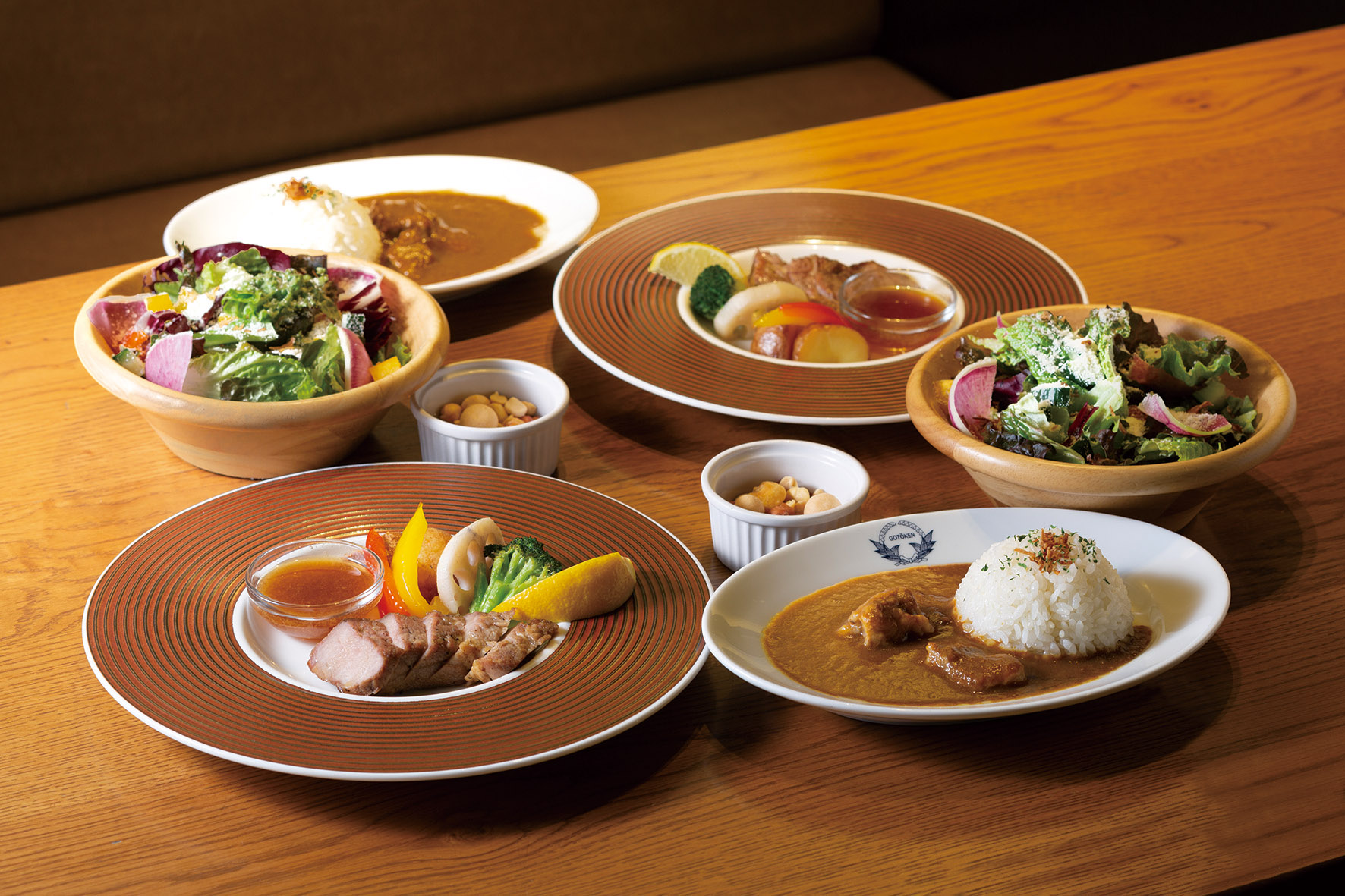 おつまみ、シーザーサラダ、豚肉のグリル、ミニカレーのセット。