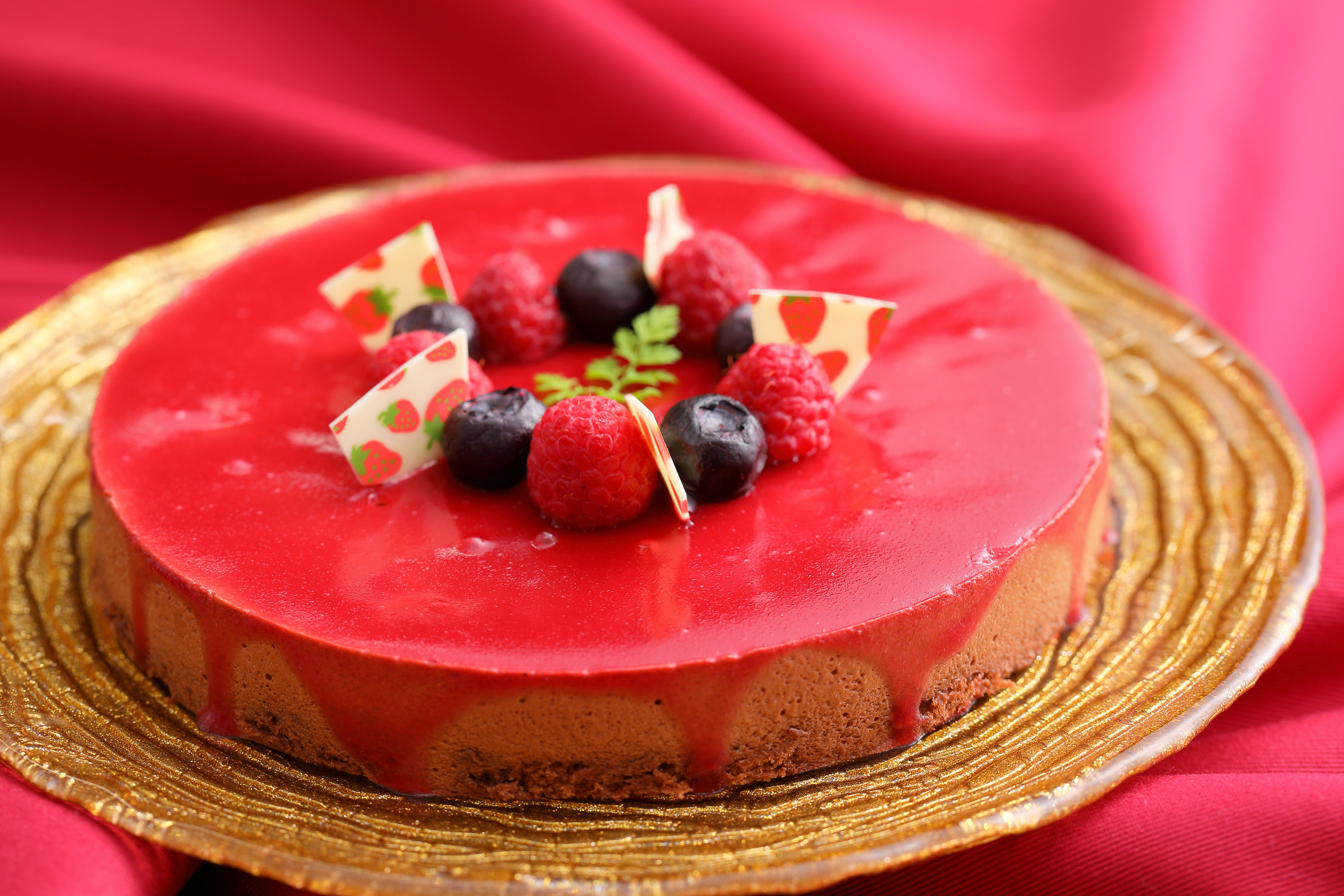 ビターチョコを使用した濃厚なチョコレートムースにフランボワーズのグラサージュで仕上げました。見た目もかわいいケーキです。