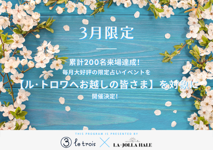 ル・トロワ×LA・JOLLA HALEがお贈りする、当ブランド会員限定で毎月行なっている占いイベントへ出演している占い師達の占いを特別に「ご予約制にて無料でご招待」いたします。