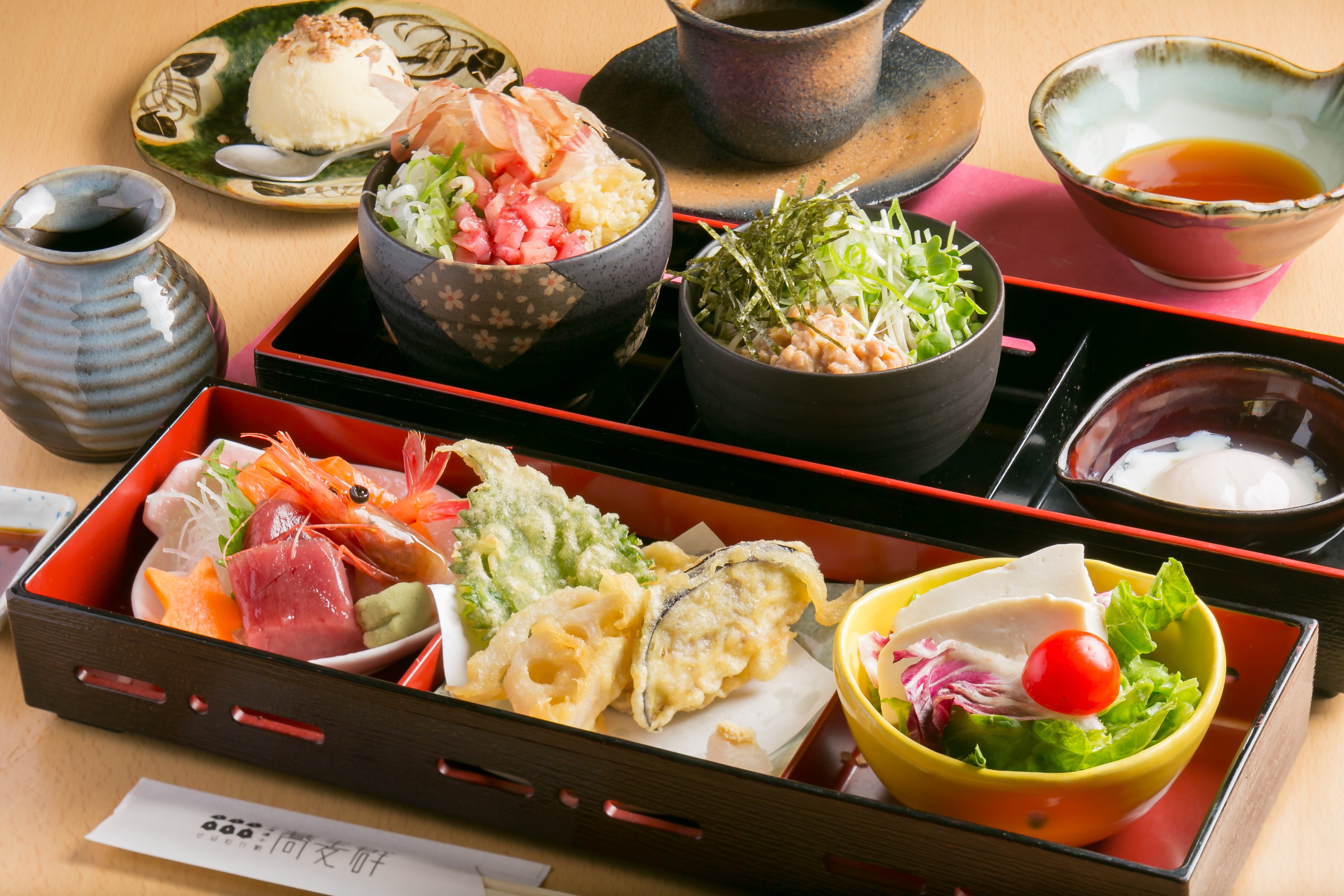 割り子そば(2種、温玉付き)に、刺身、天ぷら、サラダ、デザートとソフトドリンクが1杯セットになった、