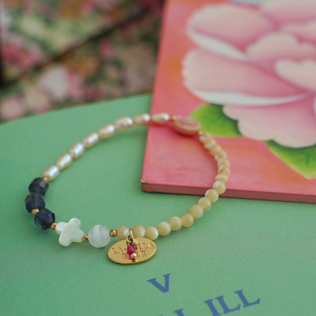 親子愛を象徴すると言われるマザーオブパール×健康を願う薬師天珠でデザインしたお守りブレスレット。