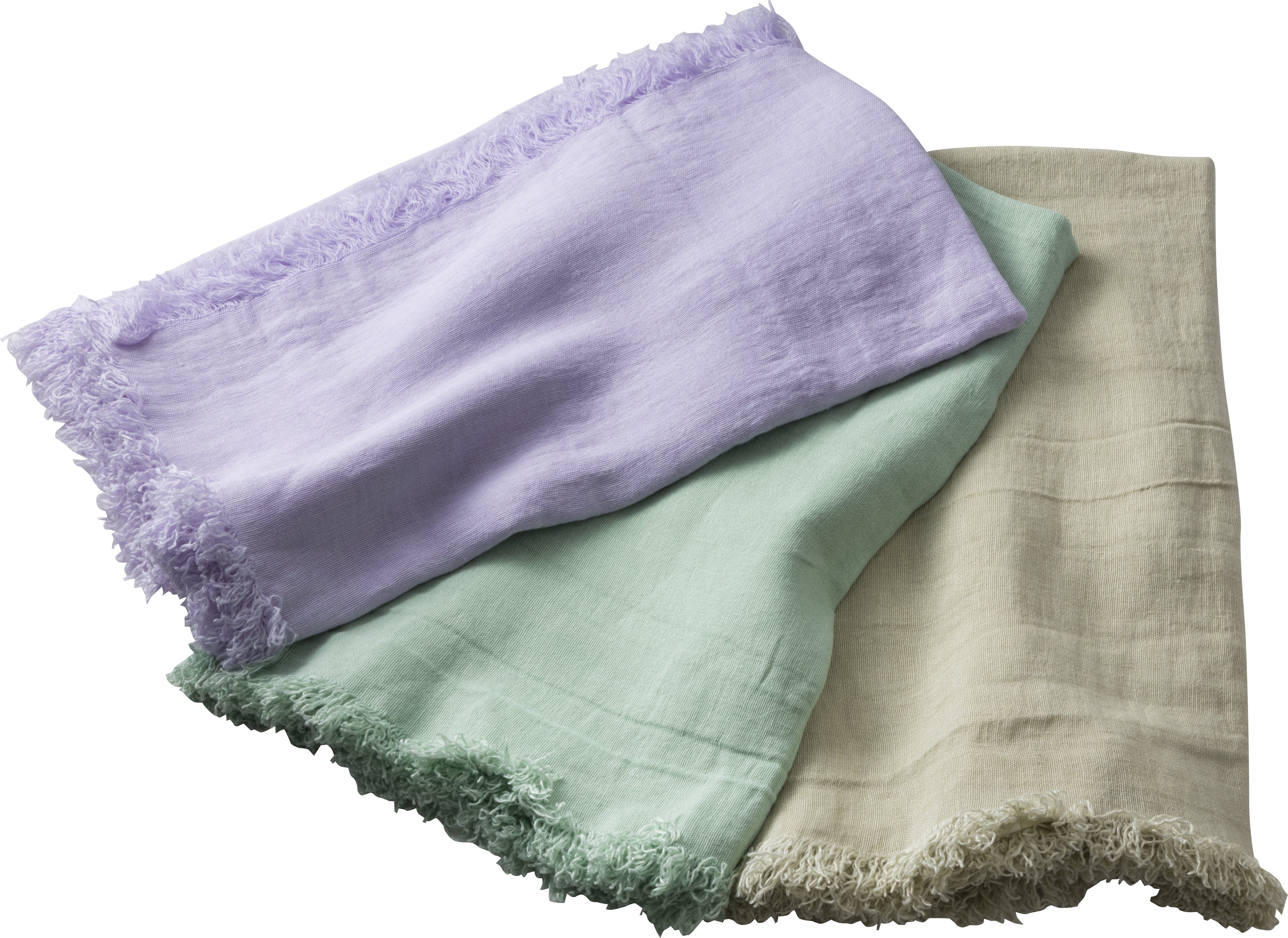 カーディガンやブルゾンの代わりに羽織れるストールは、ベルギー製のリネンを使用。フリンジがポイントに!