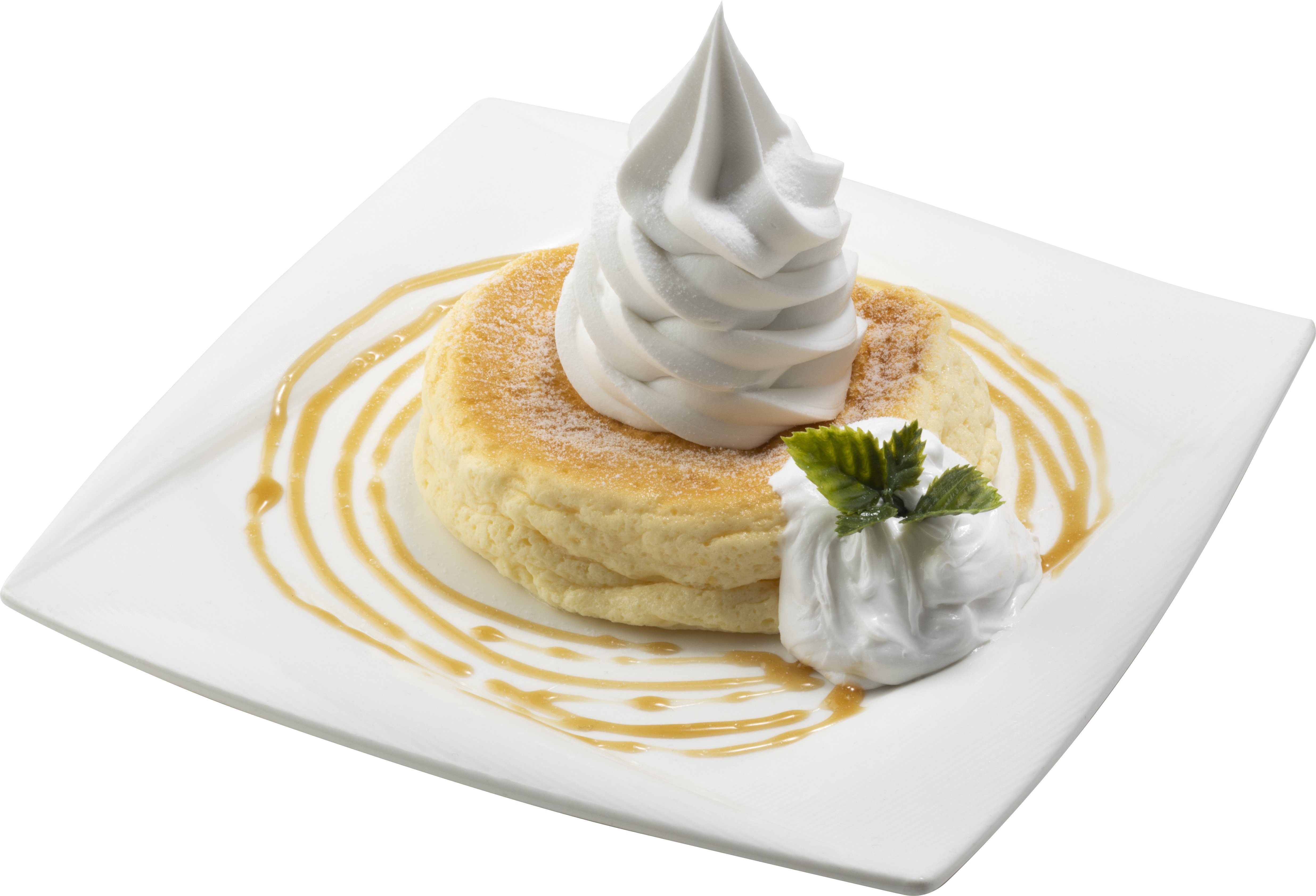店内で焼き上げたパンケーキを冷やし、ソフトクリームと道産生クリーム、キャラメルソースで仕上げたオリジナルメニュー。