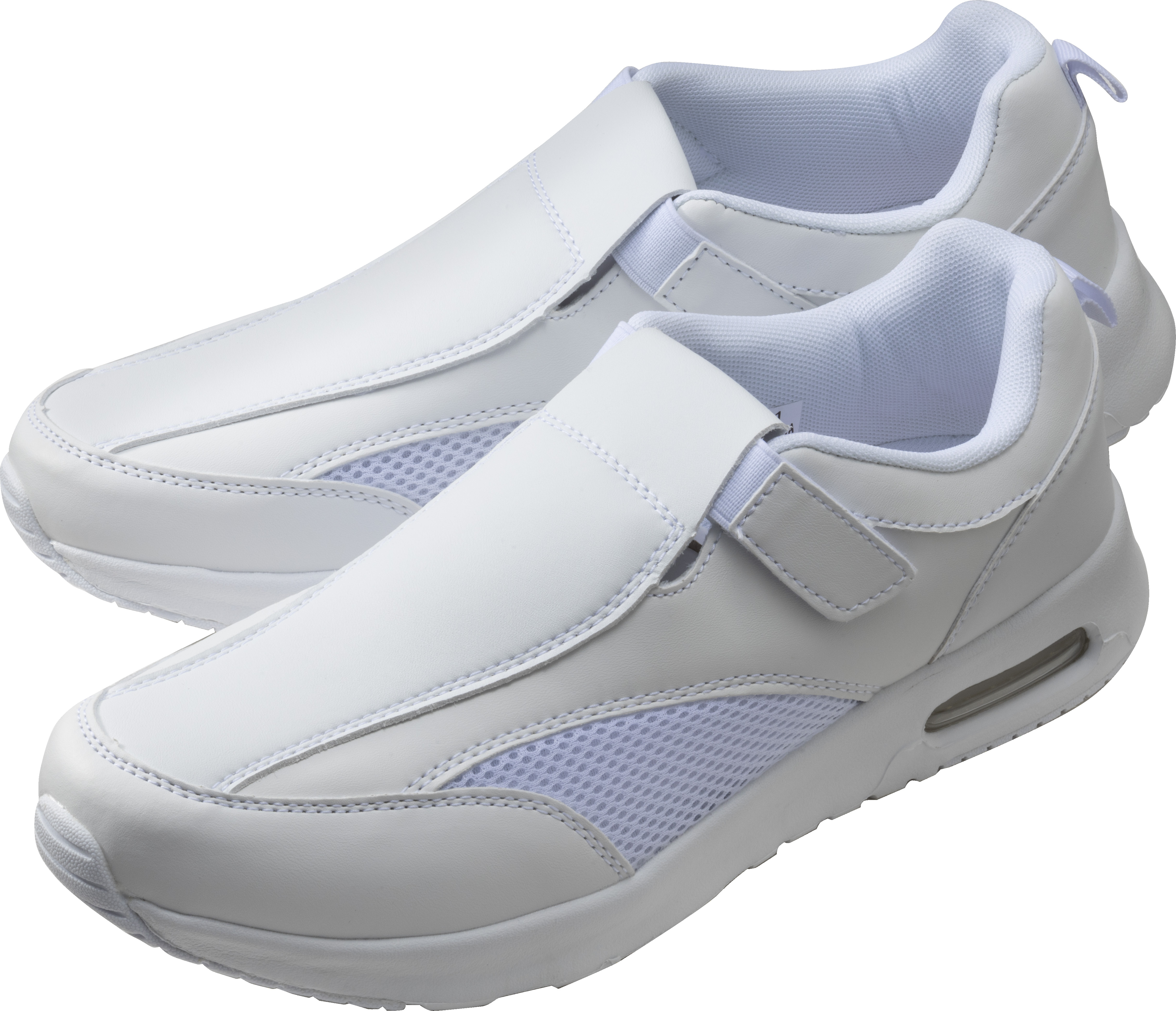 ゴム付きの伸縮ベルトは甲の締め付けがなく、甲高さんにも対応。かかとへの衝撃を吸収してくれるエアーパーツが体に優しい。