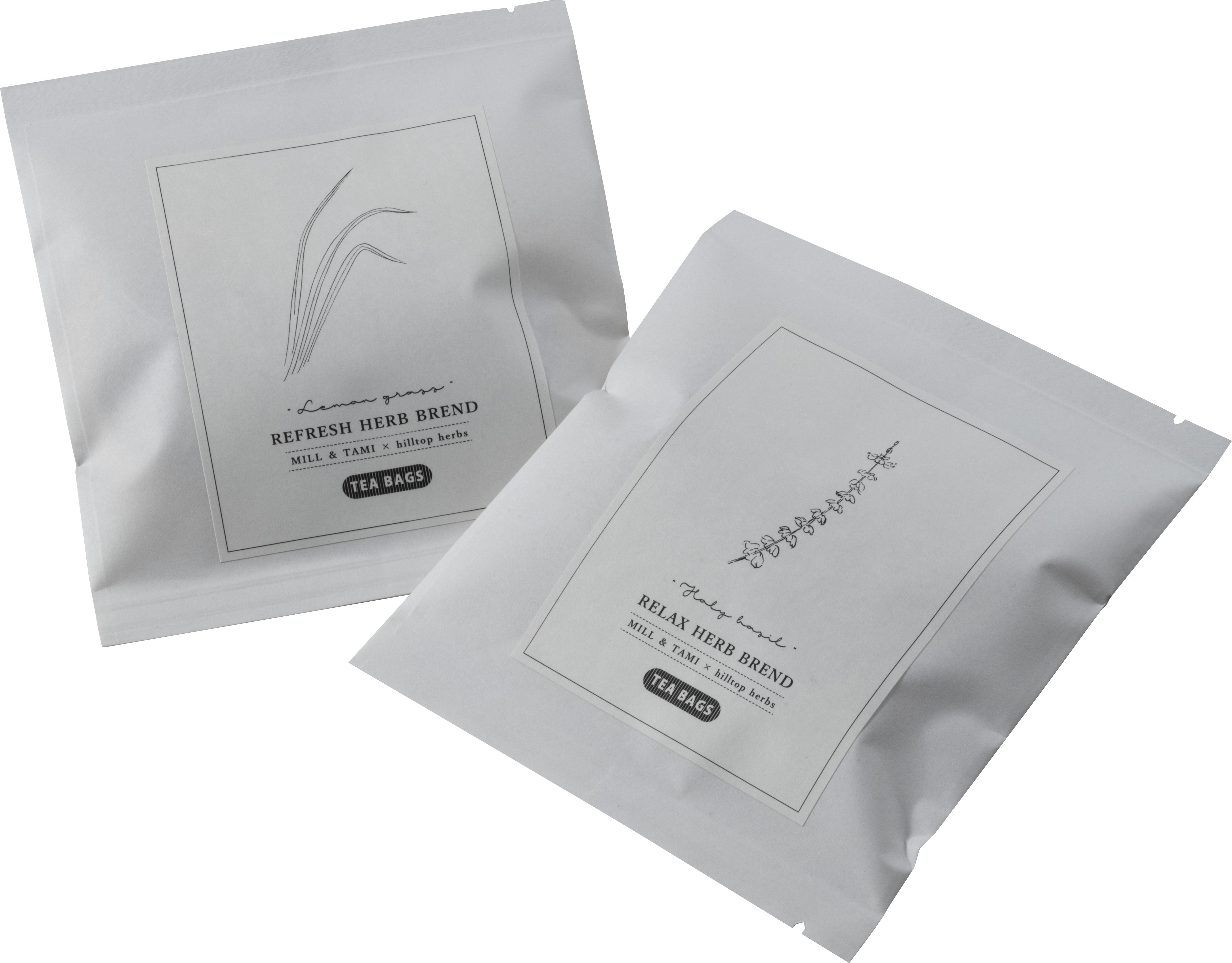 ストレスからの解放をイメージした、ホーリーバジル中心の「リラックスハーフブレンド」と、喉の殺菌や粘膜の保護を考えた、レモングラス中心の「リフレッシュブレンド」の2個(ティーバッグ)入り。