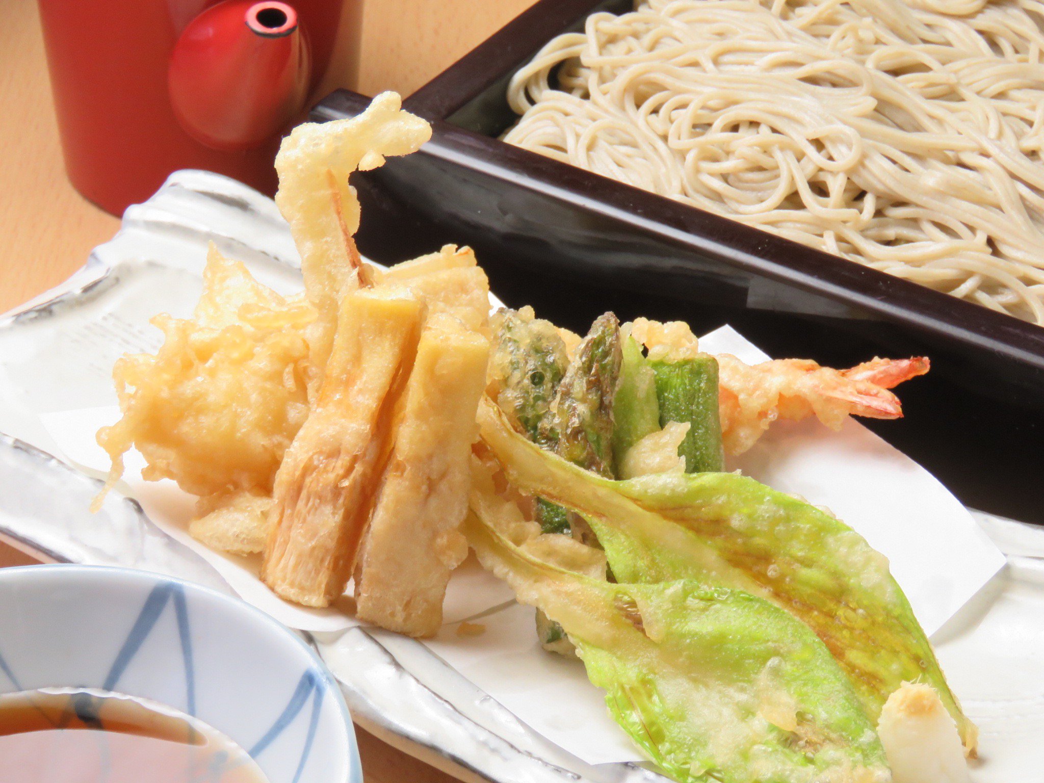 タケノコ、アスパラ、ウドなど、旬の山菜や春野菜と大海老の天ぷらがセットになったお蕎麦です。