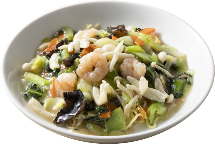 当店リピーター率が非常に高い「海鮮あんかけ焼きそば」エビ・イカ・色どり野菜を沢山入れた、サッパリ塩味仕立ての好評の1品です。