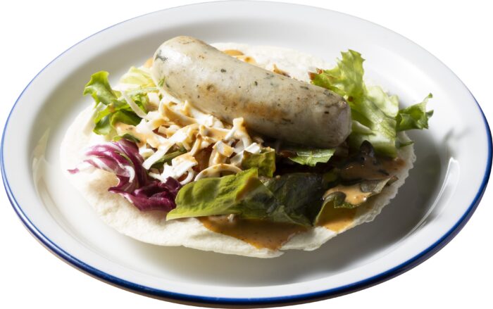 ソーセージの新しい食べ方を紹介するのが、ソーセージをまるごと1本のせたタコス。お酒のおともにもぴったりです。