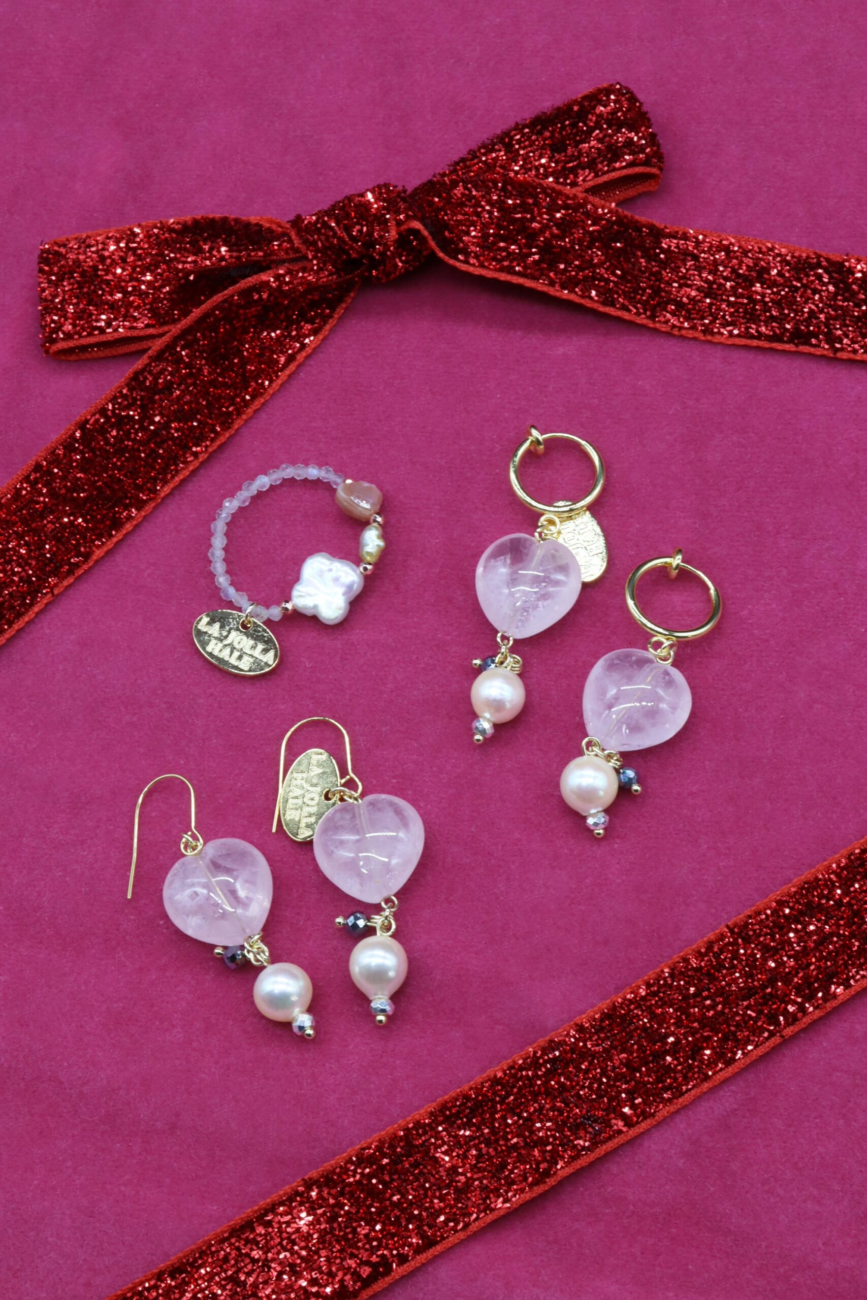 ピンク色やハートモチーフ、アコヤパールがポイント。