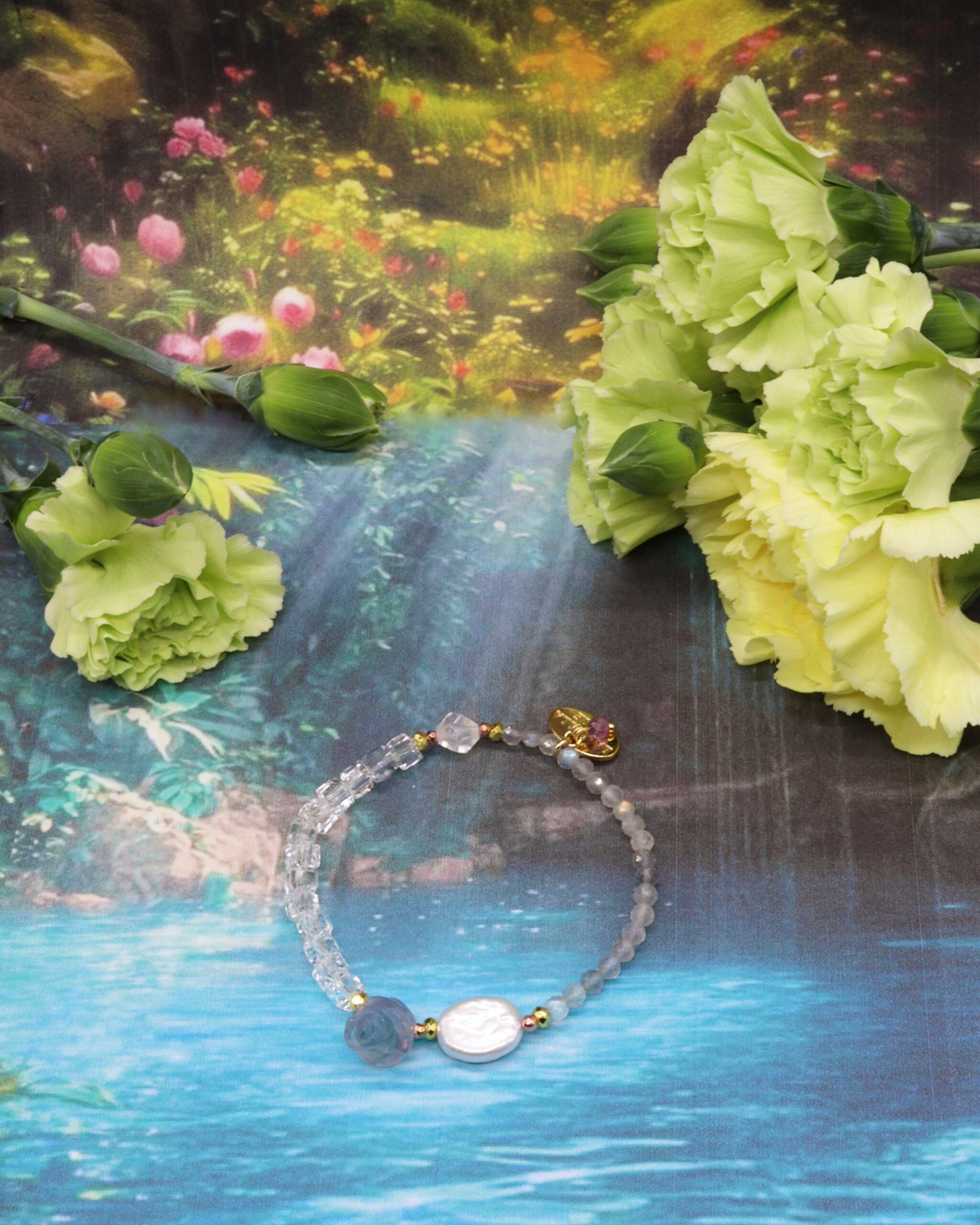 古来から身体の健康をサポートをするとされてきた、最もカラフルな天然石フローライトをメインにデザイン。